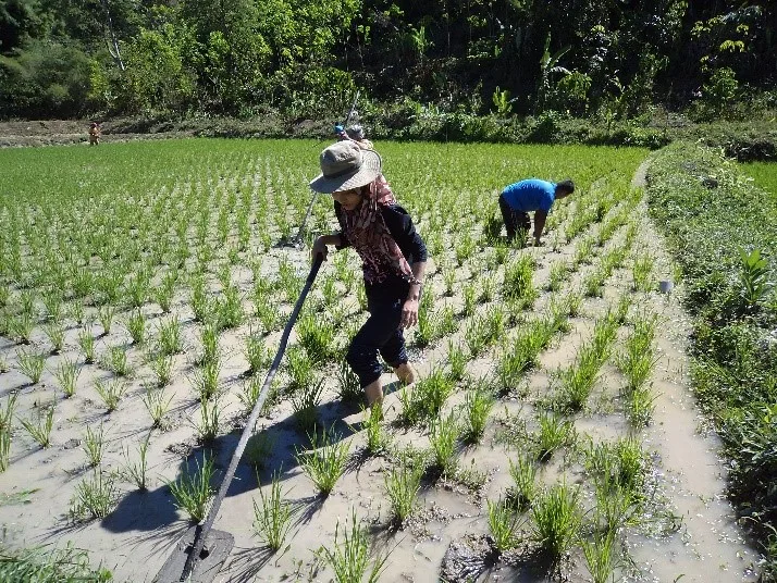 SRI management in rice fields includes: (a) Replanting seedlings that are 10-12 days old. (b) When preparing the crop, a grid pattern (25 × 25 or 30 × 30 cm) is characterized on the surface of the paddy field. At each grid point, only one seedling is planted. After being removed from the nursery, the seedlings are immediately planted to a depth of less than 1 cm. (c) In terms of soil management, the surface is aerated using a two-row rake or cono-weeder every 10-12 days until the canopy is covered. This process provides oxygen to the root system and to aerobic soil biota, while simultaneously controlling weeds. (d) For water management, the soil is kept moist but free from constant waterlogging.